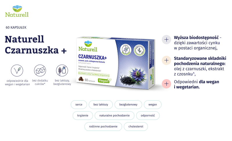 Naturell Czarnuszka+ - to suplement diety w formie kapsułek, który w swoim składzie zawiera olej z czarnuszki, ekstrakt z czosnku, witaminę E oraz cynk. Produkt przeznaczony dla dorosłych i dzieci powyżej 6. roku życia.