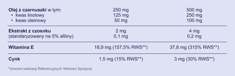 1. W każdej kapsułce znajduje się taka sama ilość aktywnych składników pochodzących z oleju z czarnuszki i ekstraktu z czosnku.