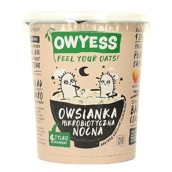 Owyess, mikrobiotyczna nocna owsianka w wygodnym kubku, skomponowana na bazie pełnoziarnistych płatków owsianych i suszonego syropu z agawy. Produkt wzbogacono o bakterie kwasu mlekowego Bacillus coagulans, dzięki czemu owsianka stanowi ciekawą propozycję dla osób, które chcą urozmaicić codzienny jadłospis. Dzięki formie jednoporcjowej owsianka jest wygodna w użyciu, a jej przygotowanie można wykonać wieczorem, oszczędzając czas o poranku. Po namoczeniu płatki stają się miękkie i kremowe, co pozwala uzyskać lekką konsystencję bez gotowania.