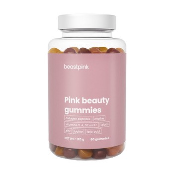 BeastPink Pink Beauty Gummies - to suplement diety w postaci żelków, który zawiera kompleks witamin, jod, cynk, cholinę i peptydy kolagenowe. Produkt przeznaczony dla osób dorosłych.