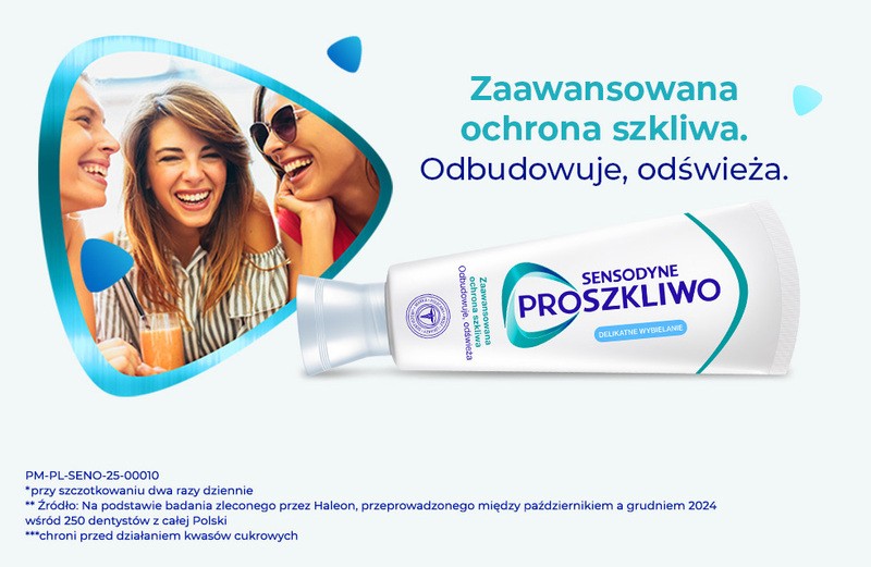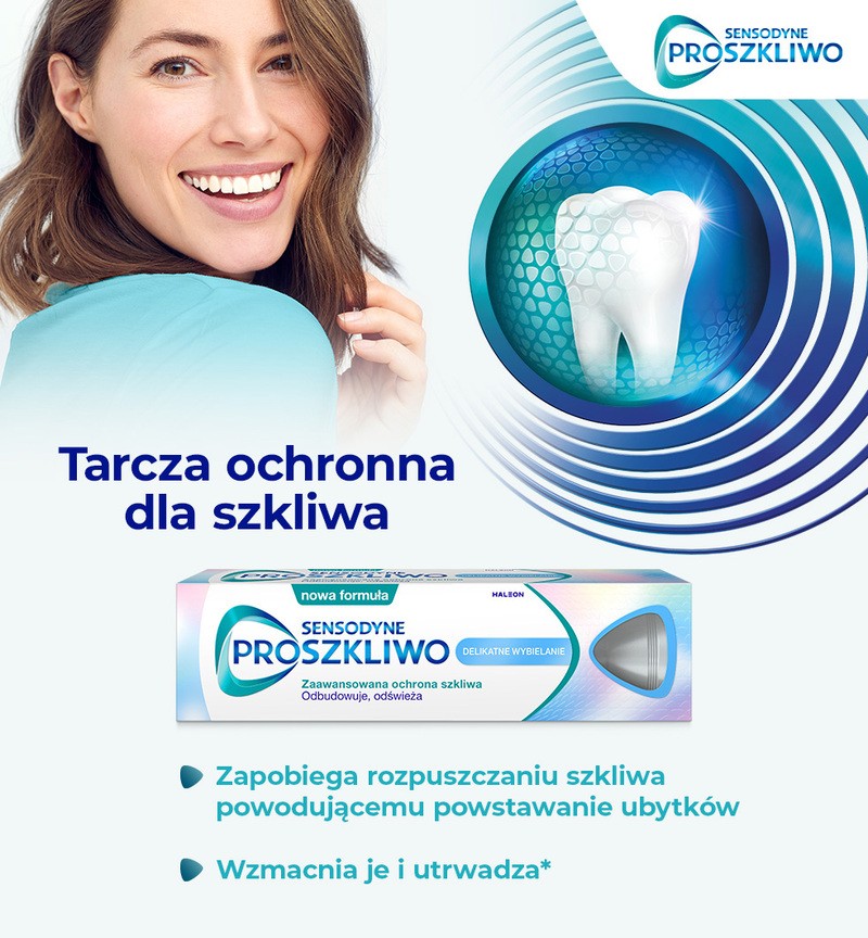 Odśwież swój uśmiech w najłagodniejszy, a jednocześnie najbardziej skuteczny sposób. Sensodyne ProSzkliwo Delikatne Wybielanie to pasta nowej generacji, która chroni i wzmacnia szkliwo, jednocześnie dbając o osoby z wrażliwymi zębami. Została stworzona z myślą o codziennym stylu życia, w którym kwasy z diety mogą stopniowo osłabiać szkliwo, a wraz z nim jasność oraz zdrowy wygląd zębów. Zaawansowana formuła pomaga odbudować, a także przywrócić szkliwo osłabione przez kwasy, przywracając mu twardość i odporność. Delikatnie wybielające składniki oczyszczają powierzchnię zębów oraz odsłaniają ich naturalny blask, bez ryzyka podrażnienia. Efekt? Uśmiech jaśniejszy, świeższy, a także zdrowszy każdego dnia. Dodatkowo pasta łagodzi nadwrażliwość, zapewnia długotrwałą świeżość i tworzy na zębach ochronną tarczę, która pomaga utrzymać idealną kondycję szkliwa. To codzienny must-have dla osób, które chcą dbać o zdrowie jamy ustnej w nowoczesny, świadomy sposób.