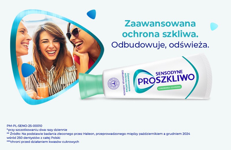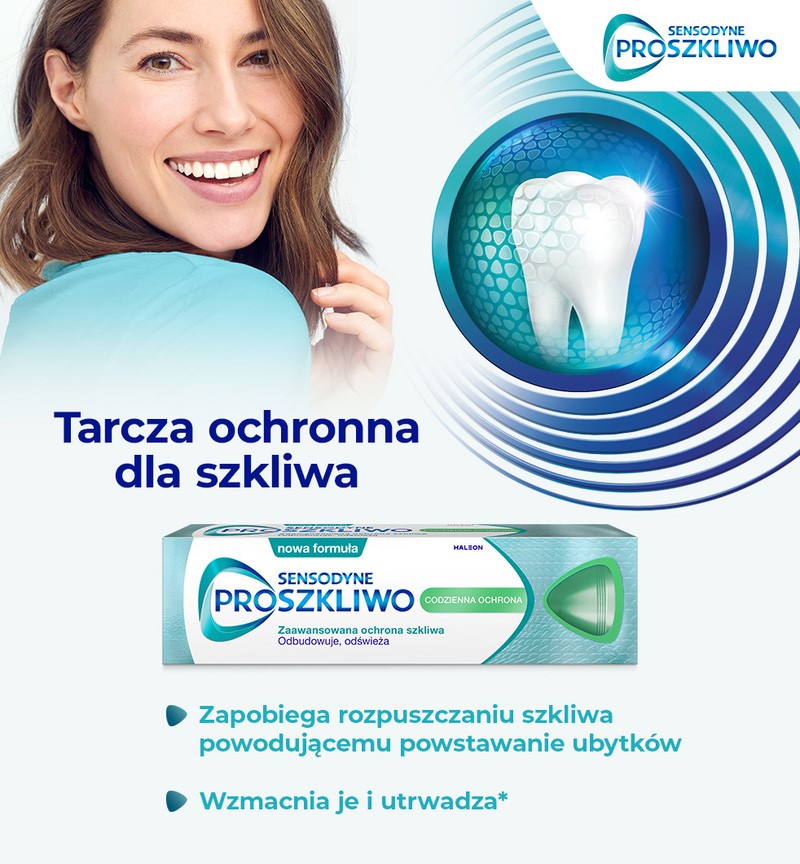 Wzmacniaj swój uśmiech każdego dnia. Sensodyne ProSzkliwo Codzienna Ochrona to pasta stworzona dla nowoczesnej pielęgnacji jamy ustnej – świadomej, skutecznej i komfortowej. Jej zaawansowana formuła pomaga przeciwdziałać temu, co najbardziej osłabia szkliwo w dzisiejszym świecie: kwasom obecnym w diecie. Z każdym szczotkowaniem ProSzkliwo wzmacnia szkliwo, wspiera jego odbudowę oraz przywraca mu odporność, aby Twoje zęby pozostały mocne, zdrowe, a także naturalnie jasne. To codzienna tarcza ochronna, która działa nawet tam, gdzie nie sięgnie zdrowa dieta. Pasta pomaga również łagodzić nadwrażliwość – tak, aby każdy łyk, uśmiech czy dotyk chłodnego powietrza był w pełni komfortowy. A jej świeży smak zapewnia długotrwałe odświeżenie i uczucie czystości, które towarzyszy Ci przez cały dzień. To pielęgnacja, która dba o szkliwo tak samo, jak o Twój styl życia – lekko oraz skutecznie.