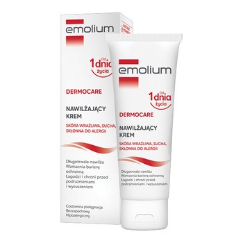 Emolium Dermocare Nawilżający krem przeznaczony jest do codziennej pielęgnacji skóry wrażliwej oraz skłonnej do alergii u niemowląt, dzieci i dorosłych. Może być stosowany od 1. dnia życia jako krem ochronny dla noworodka. Formuła wspiera długotrwałe nawilżenie skóry oraz wzmacnia barierę ochronną, przyczyniając się do poprawy jej komfortu. Produkt pomaga ograniczać nadmierne wysuszenie, zmniejsza złuszczanie naskórka oraz wspiera elastyczność skóry. Krem szybko się wchłania, łatwo rozprowadza i nie pozostawia uczucia lepkości. Posiada rekomendacje Polskiego Towarzystwa Pediatrycznego oraz Polskiego Towarzystwa Położnych.