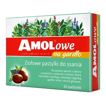 Amolowe na gardło - to suplement diety w postaci pastylek do ssania, który zawiera ekstrakty z ziela tymianku i korzenia prawoślazu, a także mentol. Produkt przeznaczony dla osób dorosłych.