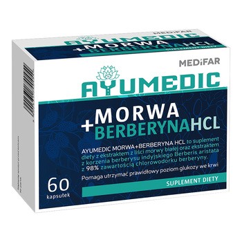 Medifar Ayumedic Morwa + Berberyna HCL - to suplement diety w postaci kapsułek twardych, który zawiera ekstrakt z morwy białej oraz berberysu indyjskiego. Produkt przeznaczony dla osób dorosłych.