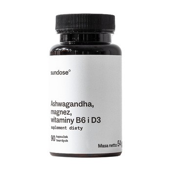Sundose Ashwagandha, magnez, witaminy B6 i D3 - to suplement diety w formie kapsułek, który w swoim składzie zawiera ashwagandhę, magnez, witaminy B6 i D3. Produkt przeznaczony dla dorosłych.