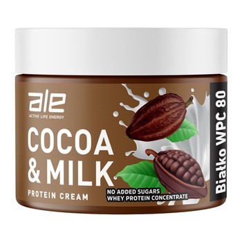 ALE Cocoa & Milk Protein Cream to krem kakaowo-mleczny z dodatkiem koncentratu białka serwatkowego WPC 80. Produkt charakteryzuje się gładką, kremową konsystencją oraz wyraźnym kakaowo-mlecznym smakiem. Nie zawiera dodatku cukrów i zawiera jedynie naturalnie występujące cukry. Jest słodzony maltitolem i przeznaczony do bezpośredniego spożycia lub jako dodatek do potraw.