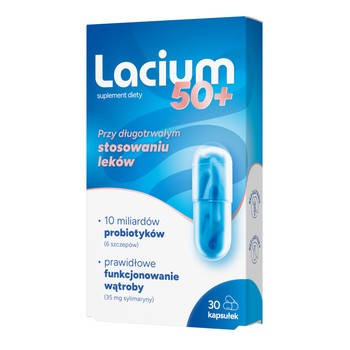Lacium 50+ - to suplement diety w postaci kapsułek twardych, który zawiera liofilizat bakterii należących do 6 różnych szczepów oraz ekstrakt z nasion ostropestu plamistego. Produkt przeznaczony dla osób dorosłych po 50. roku życia.