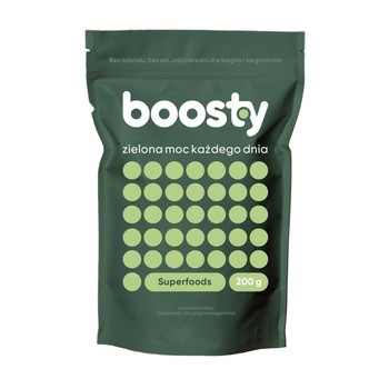 Boosty - to suplement diety w postaci proszku, który zawiera sproszkowane składniki roślinne: spirulinę, trawę pszeniczną i jęczmienną, moringę olejodajną, algi, zieloną herbatę typu Matcha, jagody acai, jarmuż oraz inulinę z agawy. Produkt przeznaczony dla osób dorosłych.
