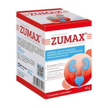 Zumax - to suplement diety w formie proszku w saszetkach, który w swoim składzie zawiera D-mannozę, ekstrakt wodny z nawłoci pospolitej oraz witaminę C. Produkt przeznaczony dla dorosłych