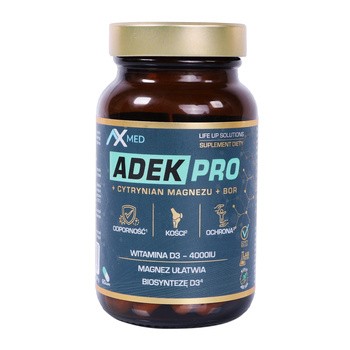 AX Med ADEK Pro - to suplement diety w postaci kapsułek, który zawiera witaminy A, D, E, K, a także cytrynian magnezu i bor. Produkt przeznaczony dla osób dorosłych powyżej 75. roku życia.