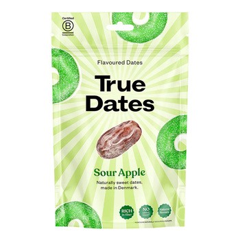 Daktyle Sour Apple TRUE DATES to innowacyjna przekąska owocowa, która łączy naturalną słodycz daktyli z wyrazistym, kwaśnym smakiem zielonego jabłka. Produkt stanowi alternatywę dla klasycznych słodyczy, oferując intensywne słodko-kwaśne doznania smakowe. Sprawdzi się zarówno jako samodzielna przekąska, jak i dodatek do innych dań.