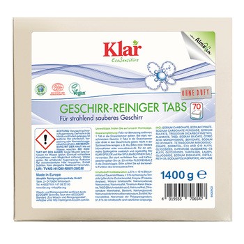 Klar, ekologiczne tabletki do zmywarek – wygodne rozwiązanie do codziennego zmywania naczyń w zmywarce. Produkt zawiera składniki wspierające skuteczne usuwanie zabrudzeń, w tym związki wybielające na bazie tlenu oraz enzymy (proteaza i amylaza). Dzięki temu tabletki sprawdzają się zarówno przy standardowym myciu, jak i przy większych zabrudzeniach – w zależności od potrzeb można zastosować 1 lub 2 tabletki. Formuła oparta w dużej części na składnikach pochodzenia naturalnego (91,8%) została opracowana z myślą o efektywnym myciu naczyń. Aby uzyskać najlepszy efekt, zaleca się stosowanie ich razem z nabłyszczaczem i solą do zmywarek Klar.