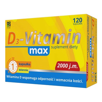 Prima Pharma D3-Vitamin Max - to suplement diety w formie kapsułek, który w swoim składzie zawiera witaminę D. Produkt przeznaczony dla zdrowej populacji osób dorosłych do 75 roku życia.