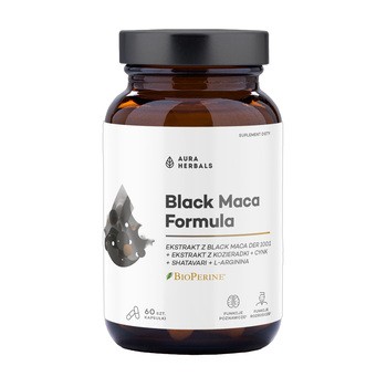 Aura Herbals Black Maca Formula - to suplement diety w postaci kapsułek, który zawiera ekstrakty z kozieradki pospolitej, czarnej macy, shatavari, pieprzu czarnego oraz cynk i chlorowodorek L-argininy. Produkt przeznaczony dla osób dorosłych.