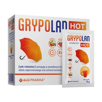 Alg Pharma Grypolan HOT - to suplement diety w postaci proszku w saszetkach, który zawiera ekstrakty z owoców aceroli, bzu czarnego, kwiatów lipy drobnolistnej, cynk oraz zagęszczony sok malinowy i z czarnej porzeczki. Produkt przeznaczony dla dzieci od 12. roku życia i dorosłych.