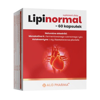 Alg Pharma Lipinormal - to suplement diety w postaci kapsułek, który zawiera ekstrakt z czerwonego fermentowanego ryżu, astaksantynę, kwas foliowy i koenzym Q10. Produkt przeznaczony dla osób dorosłych.