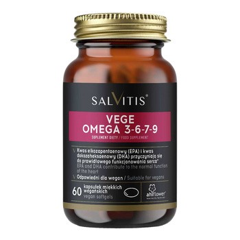Salvitis Vege Omega 3-6-7-9 - to suplement diety w postaci kapsułek, który zawiera oleje z mikroalg, nasion ogórecznika lekarskiego, owoców rokitnika zwyczajnego i nasion nawrotu polnego. Produkt przeznaczony dla osób i dzieci powyżej 15. roku życia.