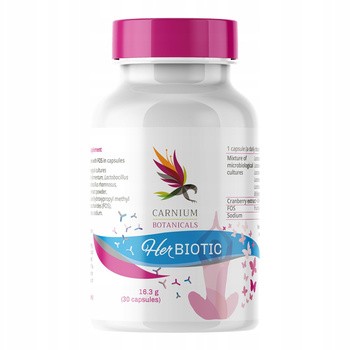 Carnium Botanicals Her Biotic - to suplement diety w formie kapsułek, który w swoim składzie zawiera m.in. mieszankę kultur bakterii probiotycznych oraz ekstrakt z żurawiny. Produkt przeznaczony dla dorosłych.