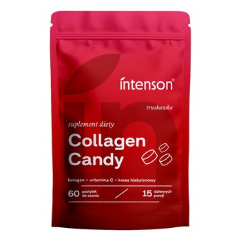 Intenson Collagen Candy - to suplement diety w postaci tabletek, który zawiera hydrolizat kolagenu wieprzowego, witaminę C i kwas hialuronowy. Produkt przeznaczony dla osób dorosłych.