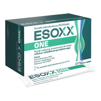 Wyrób medyczny przeznaczony do terapii refluksu żołądkowo-przełykowego. To preparat o działaniu miejscowym, osłaniającym błonę śluzową górnego odcinka przewodu pokarmowego. Pozwala na szybkie złagodzenie objawów związanych z refluksem żołądkowo-przełykowym, takich jak jak zgaga, ból w nadbrzuszu, zarzucanie treści żołądkowej do przełyku, kaszel podrażnieniowy, dysfonia (chrypka). Esoxx One zawiera kwas hialuronowy i siarczan chondroityny powlekające śluzówkę oraz poloxamer 407, składnik o wysokiej zdolności do przylegania do błony śluzowej przełyku.