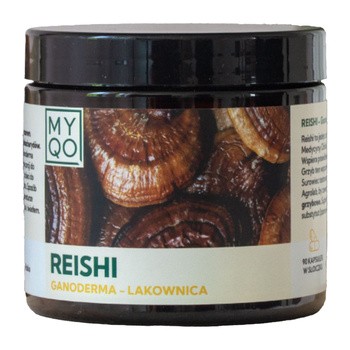 MYQO Reishi - Ganoderma lucidum - Lakownica lśniąca - to suplement diety w postaci kapsułek, który zawiera organiczny ekstrakt z owocni grzyba Reishi. Produkt przeznaczony dla osób dorosłych.