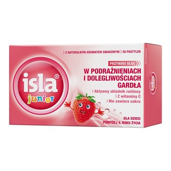 Pastylki Isla Junior wskazane są w celu łagodzenia dolegliwości związanych z przeziębieniem (drapanie, chrypka), ochrony suchej i podrażnionej błony śluzowej gardła i krtani oraz w przypadkach utrudnionego oddychania przez nos.