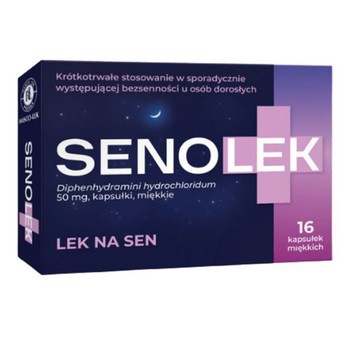 Senolek to lek w postaci kapsułek miękkich, zawierający w składzie difenhydraminy chlorowodorek. Difenhydramina zaliczana jest do leków przeciwhistaminowych o działaniu nasennym i uspokajającym. Produkt leczniczy jest przeznaczony do krótkotrwałego stosowania w sporadycznie występującej bezsenności u osób dorosłych.