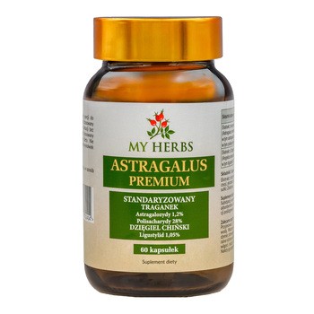 My Herbs Astragalus Premium - to suplement diety w postaci kapsułek, który zawiera ekstrakty z traganka błoniastego i dzięgla chińskiego. Produkt przeznaczony dla osób dorosłych.
