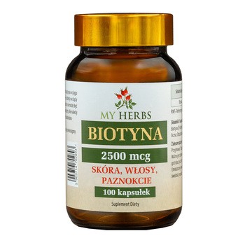 My Herbs Biotyna 2500 mcg - to suplement diety w postaci kapsułek, który zawiera biotynę. Produkt przeznaczony dla osób dorosłych.