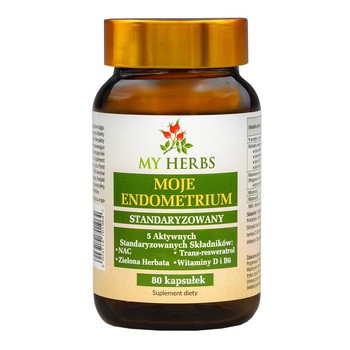 My Herbs Moje Endometrium - to suplement diety w postaci kapsułek, który zawiera NAC, witaminy D i B6, a także ekstrakty z zielonej herbaty i rdestowca japońskiego. Produkt przeznaczony dla osób dorosłych.