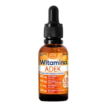 Asepta Witamina ADEK - to suplement diety w formie kropli, który w swoim składzie zawiera witaminy A, D, E i K. Produkt przeznaczony dla osób zdrowych powyżej 75. roku życia.