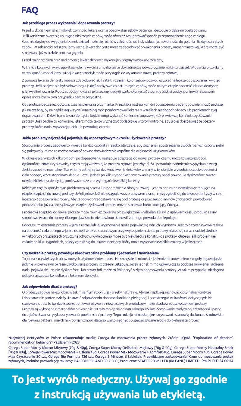 - Usunąć resztki kremu z protezy i jamy ustnej za pomocą ciepłej wody i miękkiej szczoteczki.