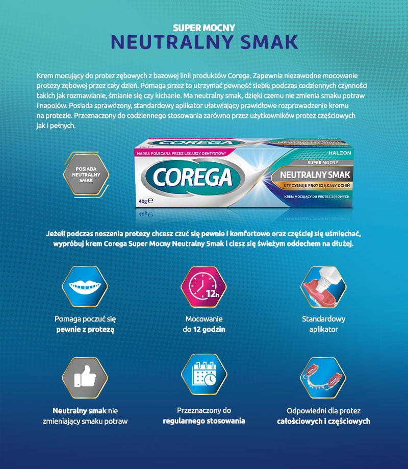 Krem do protez Corega Super Mocny przeznaczony jest do mocowania protez zębowych całkowitych i częściowych.