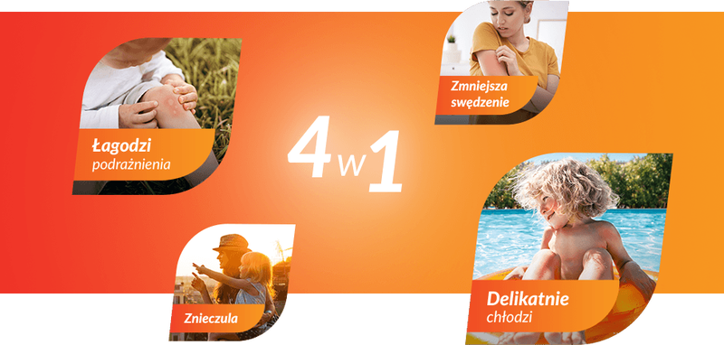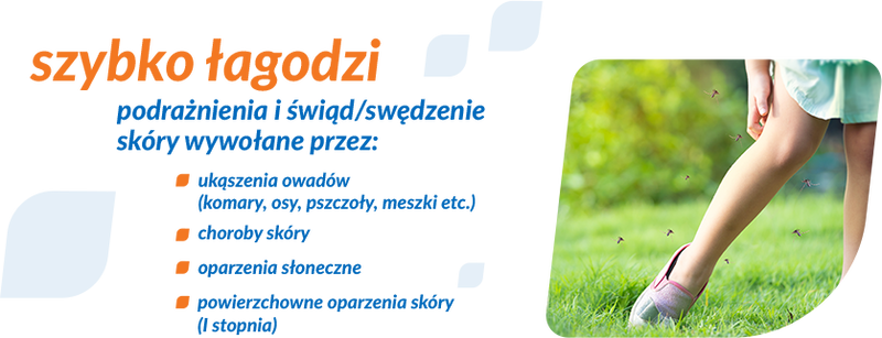 Świąd towarzyszący chorobom skóry, pokrzywce, ukąszeniom owadów, oparzeniom słonecznym, powierzchownym oparzeniom skóry (pierwszego stopnia).