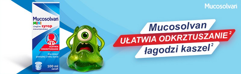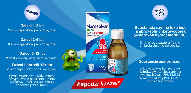 MUCOSOLVAN MINI, syrop, 5 ml syropu zawiera 15 mg chlorowodorku ambroksolu. Wskazania: Ostre i przewlekłe choroby płuc i oskrzeli przebiegające z zaburzeniem wydzielania śluzu oraz utrudnieniem jego transportu. Podmiot odpowiedzialny: Opella Healthcare Poland Sp. z o.o., {ChPL 04/2024}