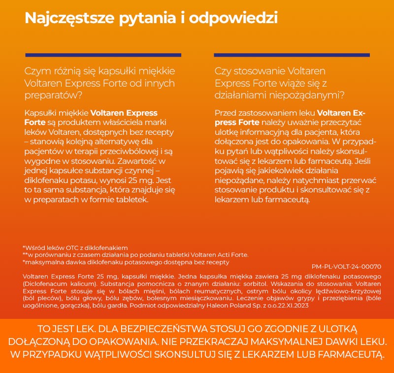 - Przed rozpoczęciem przyjmowania Voltarenu Express Forte należy zwrócić się do lekarze jeśli w przeszłości występowały zaburzenia dotyczące przewodu pokarmowego, występują zaburzenia jelitowe, występują astma, zaburzenia czynności nerek, jeśli jednocześnie stosowane sa inne leki przeciwzapalne lub przeciwbólowe.