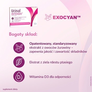 Urinal Intensiv - suplement diety zawierajacy ekstrakty z nawłoci pospolitej i żurawiny wielkoowocowej oraz witaminę D.