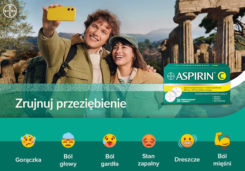 Wskazania: Objawowe leczenie dolegliwości bólowych o małym i (lub) umiarkowanym nasileniu (np: bóle głowy, bóle zębów, bóle mięśniowe). Objawowe leczenie dolegliwości bólowych i gorączki w przebiegu przeziębienia i grypy. Przeciwwskazania: nadwrażliwość na substancję czynną - kwas acetylosalicylowy, inne salicylany lub jakikolwiek inny składnik preparatu, skaza krwotoczna, ostra choroba wrzodowa żołądka lub dwunastnicy, napady astmy oskrzelowej w wywiadzie, wywołane podaniem salicylanów lub substancji o podobnym działaniu, szczególnie niesteroidowych leków przeciwzapalnych, jednoczesne stosowanie metotreksatu w dawkach 15 mg na tydzień lub większych, ciężka niewydolność serca, ciężka niewydolność wątroby lub ciężka niewydolność nerek, ostatni trymestr ciąży, dzieci poniżej 12 lat, kamica nerkowa, hiperoksaluria, hemochromatoza. Podmiot odpowiedzialny: Bayer Sp. z o.o., Al. Jerozolimskie 158, 02-326 Warszawa, tel. (22) 5723500, fax (22) 5723500, www.bayer.com.pl V5/11.07.2022/MK