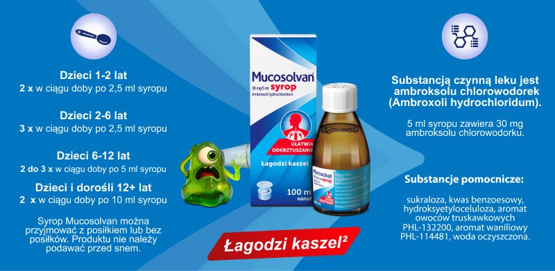 Mucosolvan, syrop, 5 ml syropu zawiera 30 mg chlorowodorku ambroksolu. Wskazania: Ostre i przewlekłe choroby płuc i oskrzeli przebiegające z zaburzeniem wydzielania śluzu oraz utrudnieniem jego transportu. Podmiot odpowiedzialny: Opella Healthcare Poland Sp. z o.o., {ChPL 04/2024}