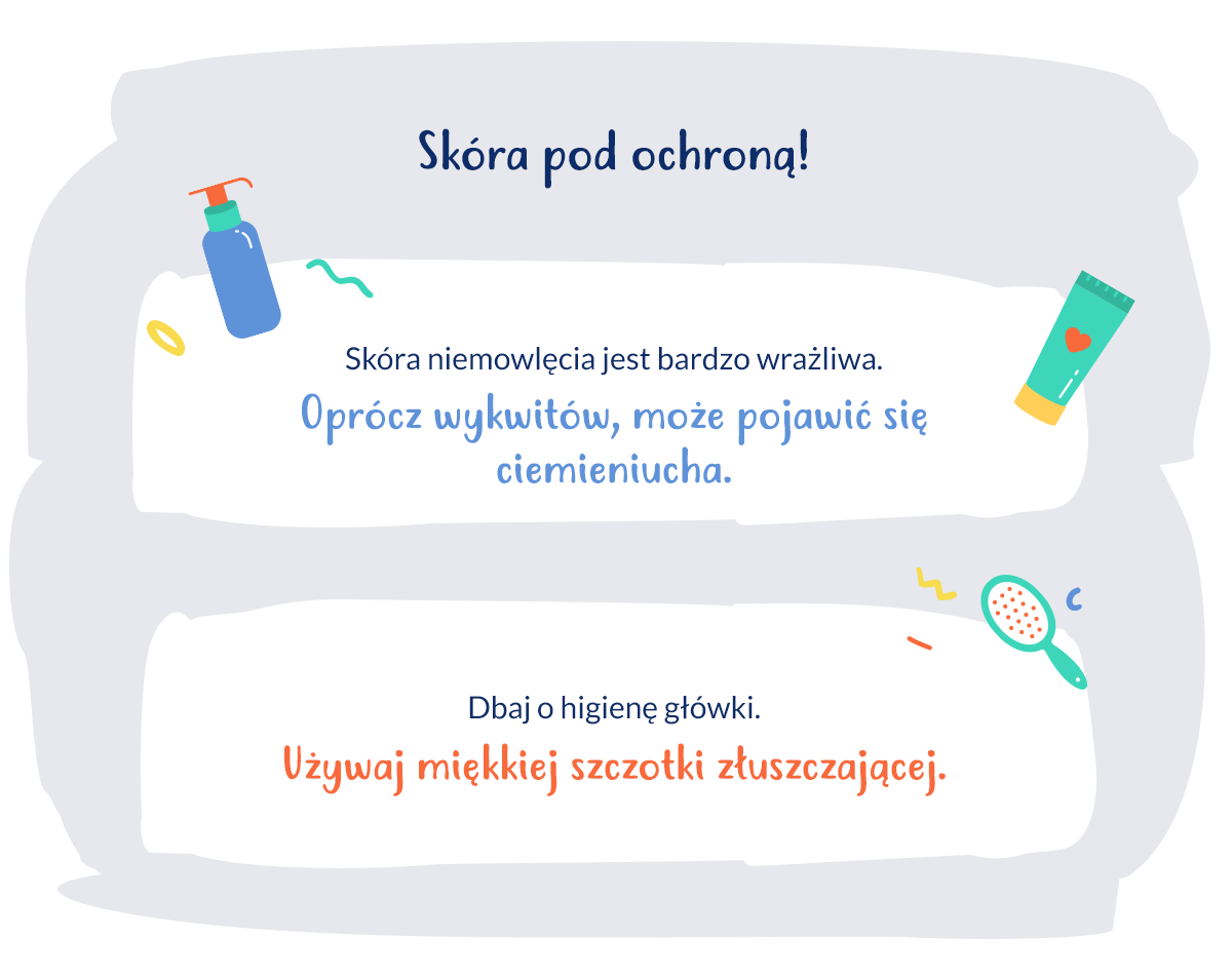 Skóra dziecka nadal może być pokryta różnymi wykwitami o słabym lub średnim nasileniu. Na nosku nadal są białe kropeczki, w okolicach ciemiączka może pojawić się „łuska” — żółta skorupka zwana ciemieniuchą. Zwalczanie ciemieniuchy jest uciążliwe, ale w przypadku łagodnej postaci wystarczy dbać o higienę główki dziecka, ewentualnie próbować sczesywać miękką szczoteczką złuszczający się naskórek. Dostępne preparaty na rynku pomagają rozmiękczyć zmiany przed usunięciem, ale nie zapobiegają nawrotom zmiany.