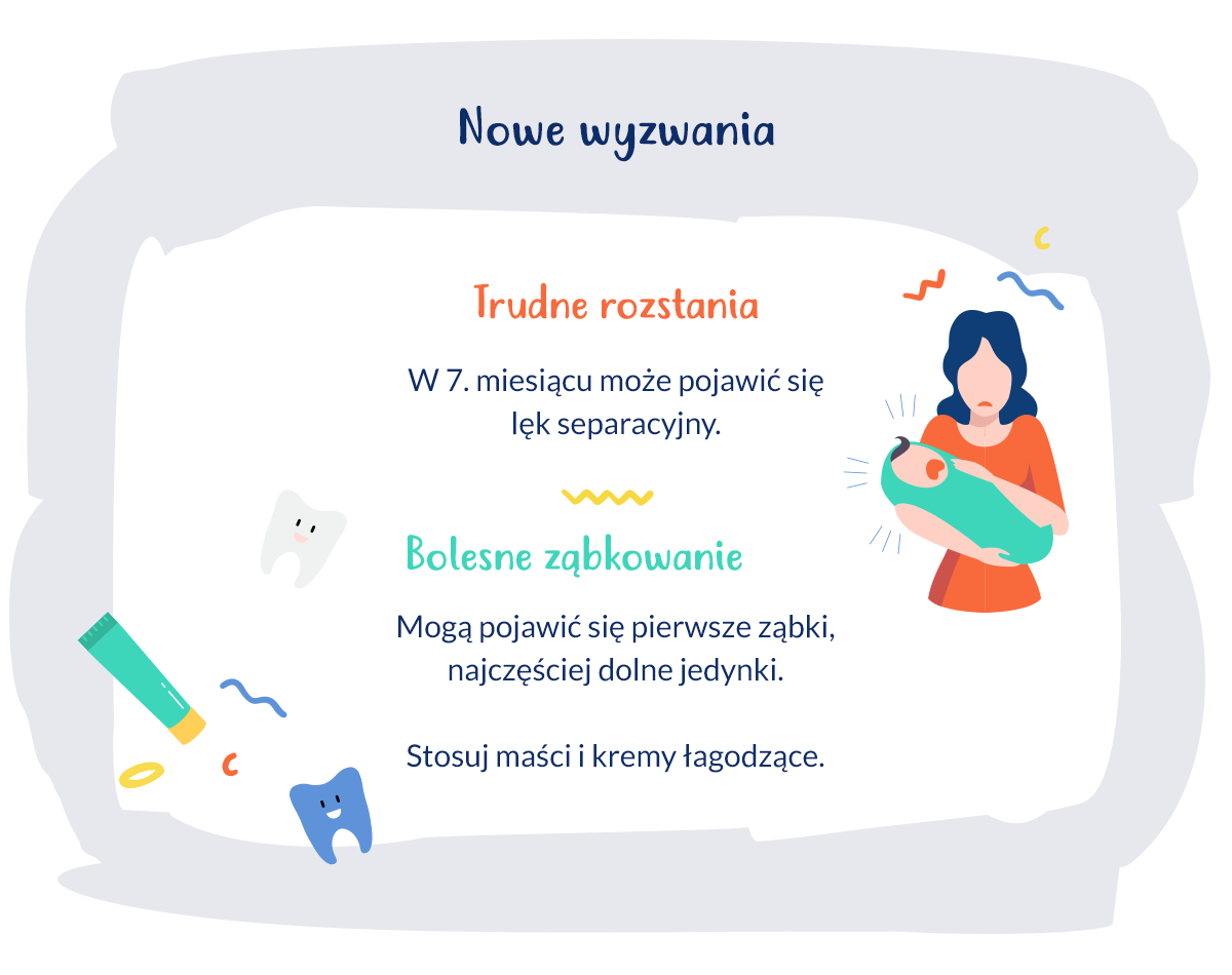 Mogą pojawić się pierwsze ząbki, dolne jedynki. Proces wyrzynania ząbków bywa bolesny dla dziecka, warto wspomagać się maściami i kremami łagodzącymi. Czasem dzieci przy ząbkowaniu są marudne, mają podwyższoną temperaturę ciała. Doraźnie można zastosować lek obniżający temperaturę ciała, ale jeśli stan utrzymuje się przez trzy dni lub gwałtownie się nasila trzeba skonsultować się z pediatrą.