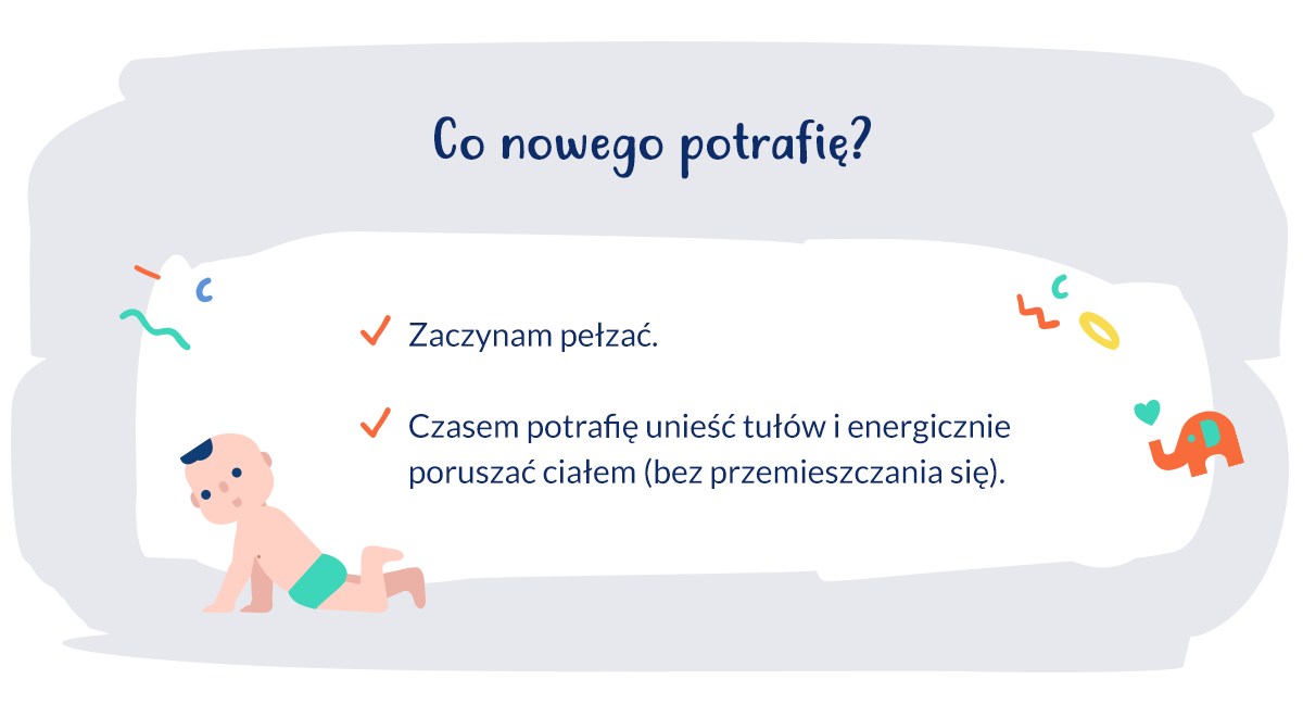 Dzieci w tym wieku powinny stabilnie trzymać główkę, większość aktywności odbywa się na brzuszku. Dziecko powoli zaczyna pełzać, niektóre maluchy potrafią unieść tułów i energicznie poruszać ciałem, ale bez przemieszczania się. Obracanie z brzuszka na plecy i odwrotnie zaczyna być coraz bardziej płynne. Twarz jest pełna emocji, dziecko śmieje się, gaworzy, ale może być też smutne lub złe. Reaguje na osoby bliskie, wyciąga rączki ku ramionom rodzica. Może w tym czasie pojawić się lęk separacyjny, dzieci mogą być bardzo silnie związane z mamą i niechętnie przebywać bez towarzystwa.