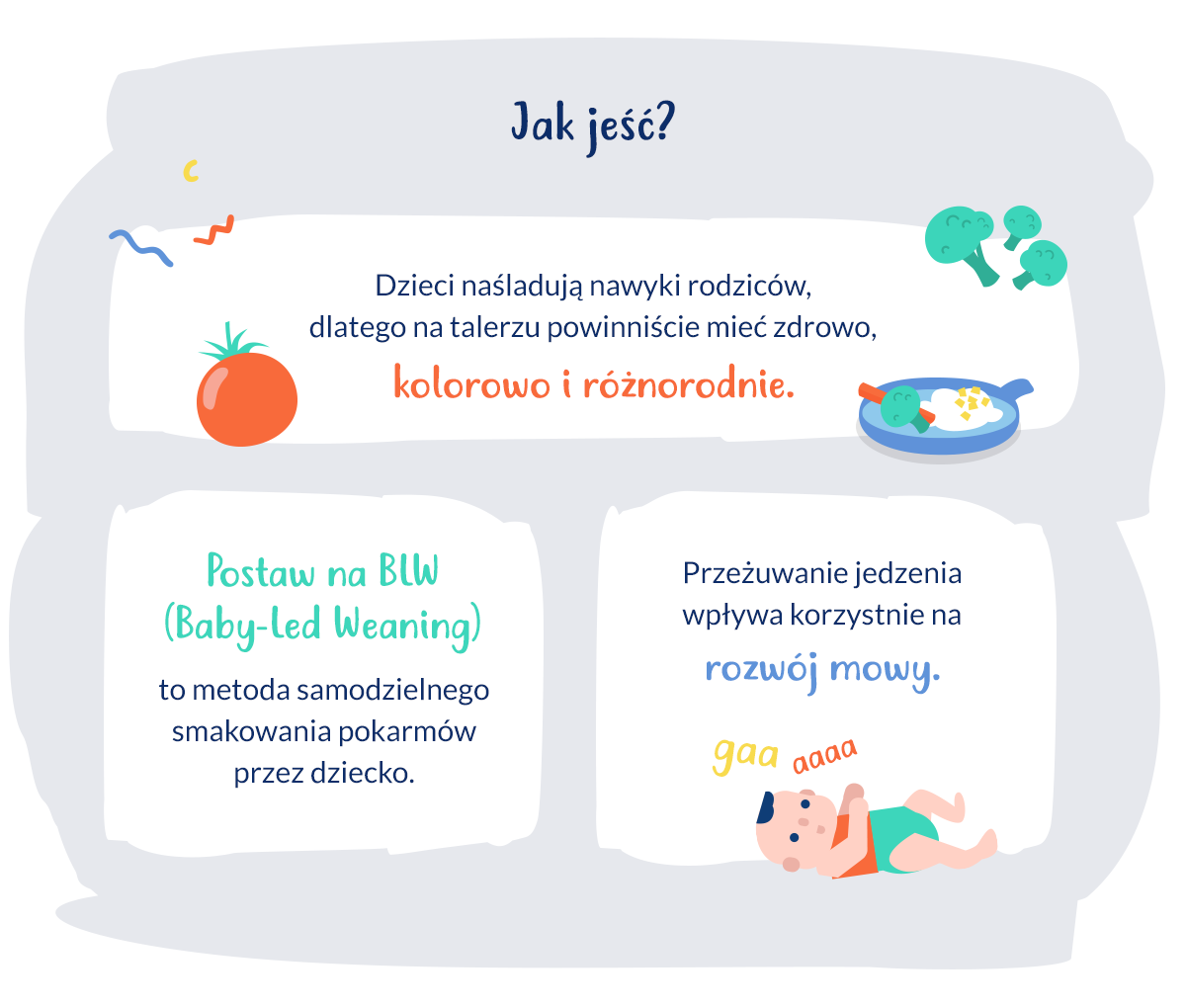 Pokarm mamy nadal stanowi dla siedmiomiesięcznego dziecka podstawę diety. Rodzice powinni zachęcać malucha do smakowania i próbowania nowych produktów. Dzieci najlepiej uczą się przez naśladownictwo, więc rodzice powinni mieć kolorowo i różnorodnie na talerzu, aby dawać dobre wzorce dziecku – sposób odżywiania zdrowej rodziny powinien być zróżnicowany, bogaty w warzywa i owoce, mięso i ryby, produkty zbożowe, ale przede wszystkim powinny być to produkty wysokiej jakości.