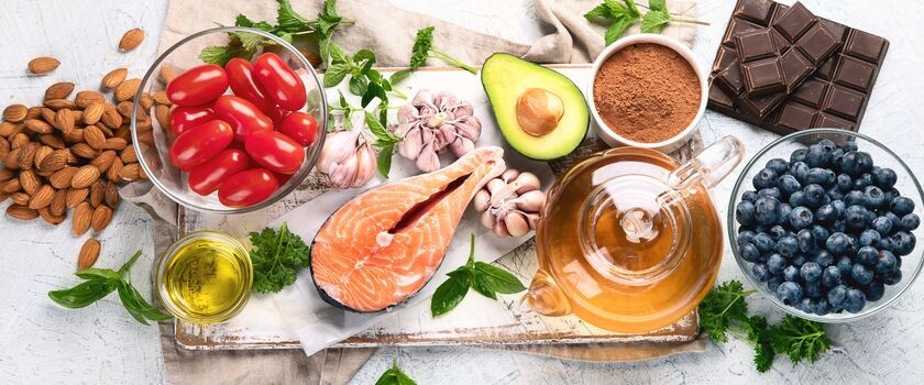 - Warzywa i owoce bogate w antyoksydanty: jarmuż, szpinak, natka pietruszki, brokuły, kalafior, brukselka, buraki, papryka, pomidory, czarne jagody, borówki amerykańskie, czarne porzeczki, truskawki, maliny, jeżyny, cytrusy itp.